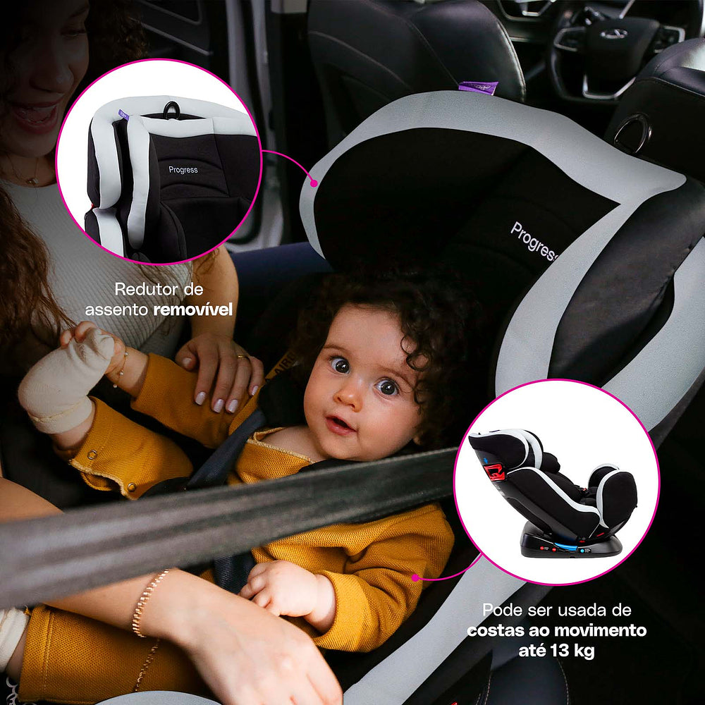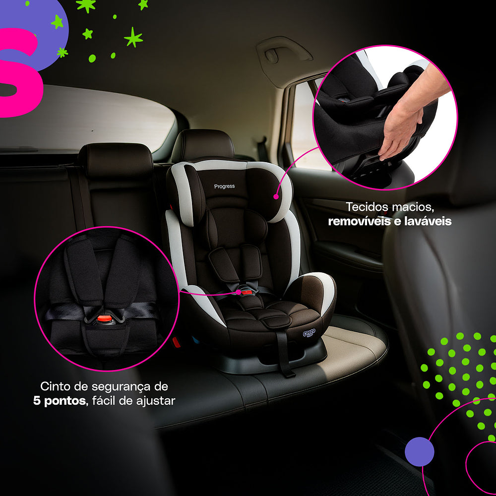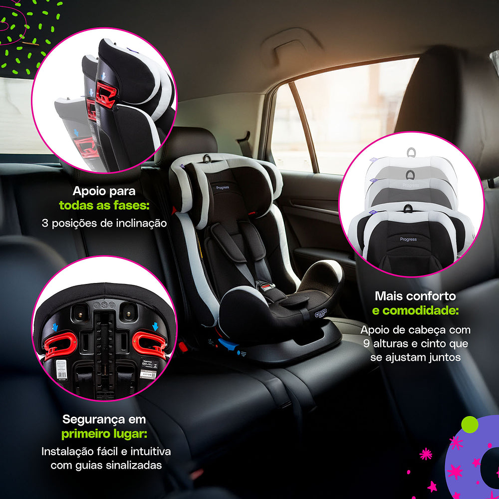 Desde o primeiro dia até cerca de 10 anos, a Progress cresce junto com a família, trazendo segurança, conforto e praticidade para a rotina. Com inclinação ajustável em 3 posições, ela é perfeita para uma soneca gostosa ou para curtir o caminho com os olhinhos cheios de curiosidade. O apoio de cabeça regulável em 9 alturas garante o encaixe perfeito em cada fase de crescimento.