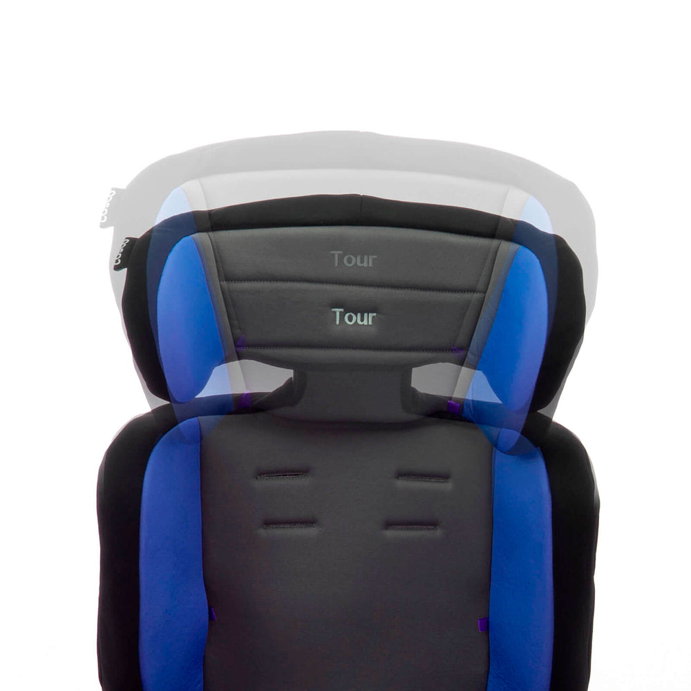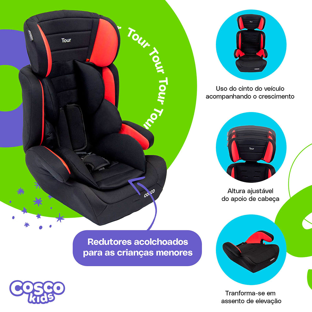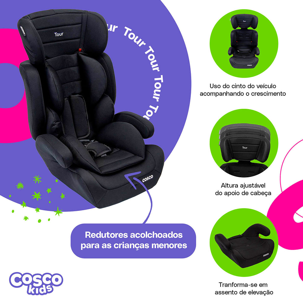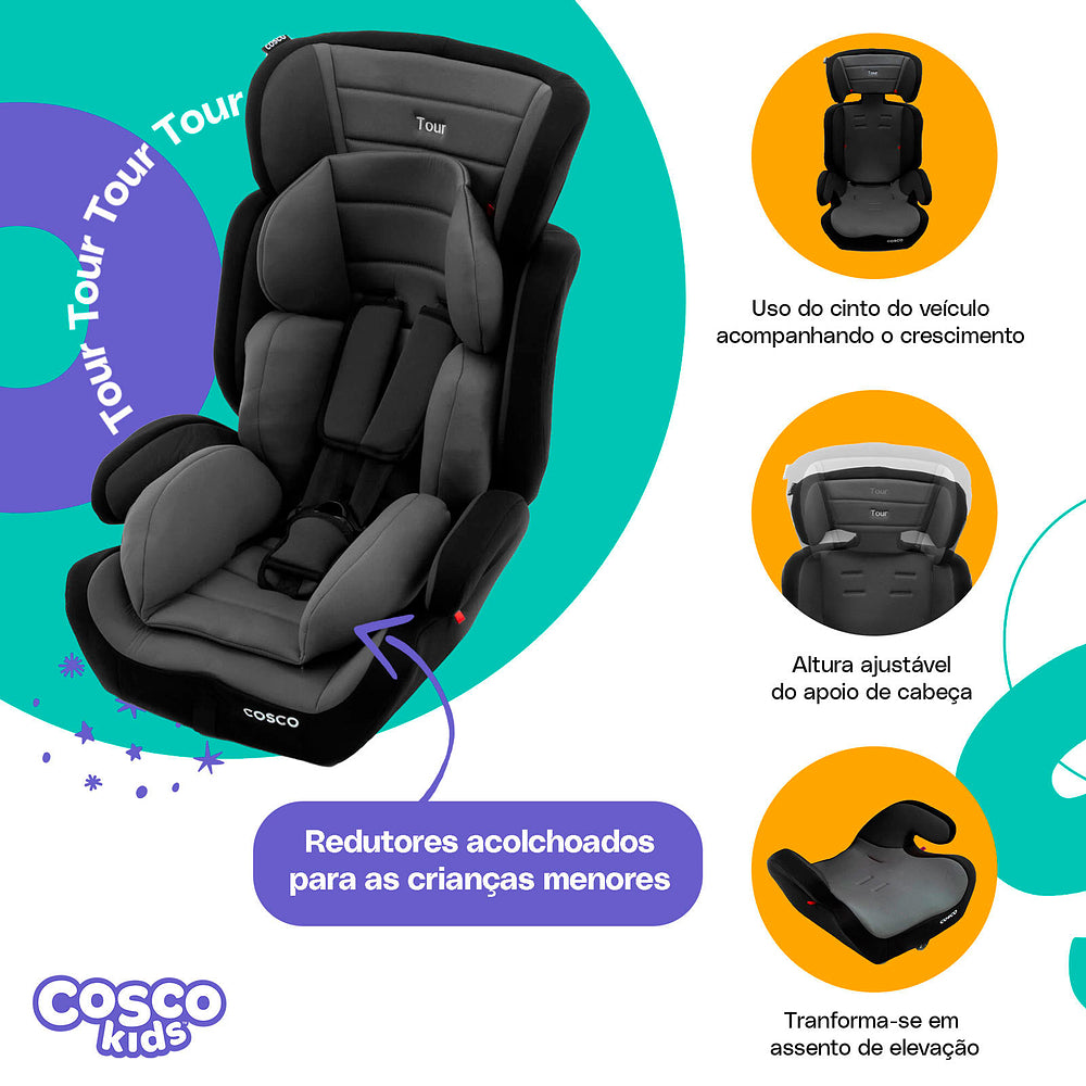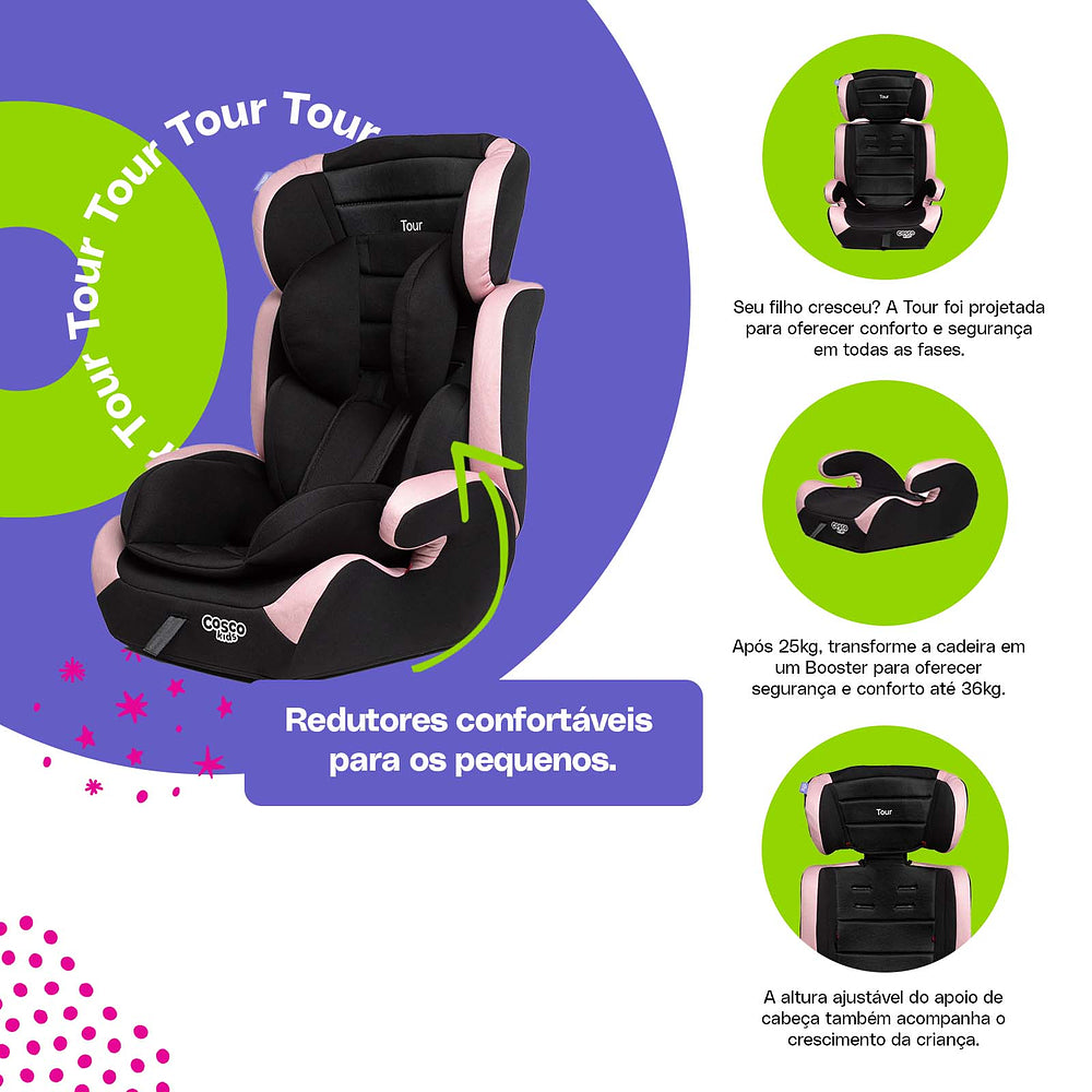 Ela acomoda os menores com almofadas redutoras que podem ser removidas quando não forem mais necessárias. A altura do apoio de cabeça também é ajustável: vai crescendo com seu filho, junto com a altura do cinto da cadeirinha. No grupo 2, a partir de 15 kg, com seu filho sentadinho, cinto do veículo é que vai dar conta do recado, passando sobre ele. E quando ele já estiver no grupo 3, ou seja, a partir dos 22 kg, você pode tirar a parte do encosto e usar só o assento da Tour, como um booster.