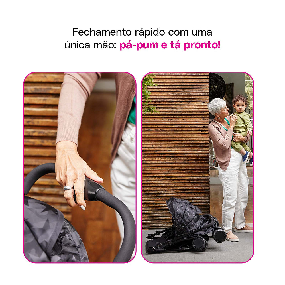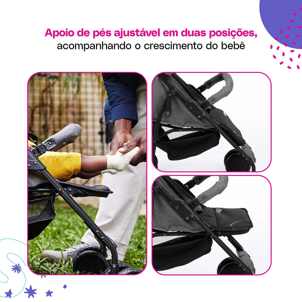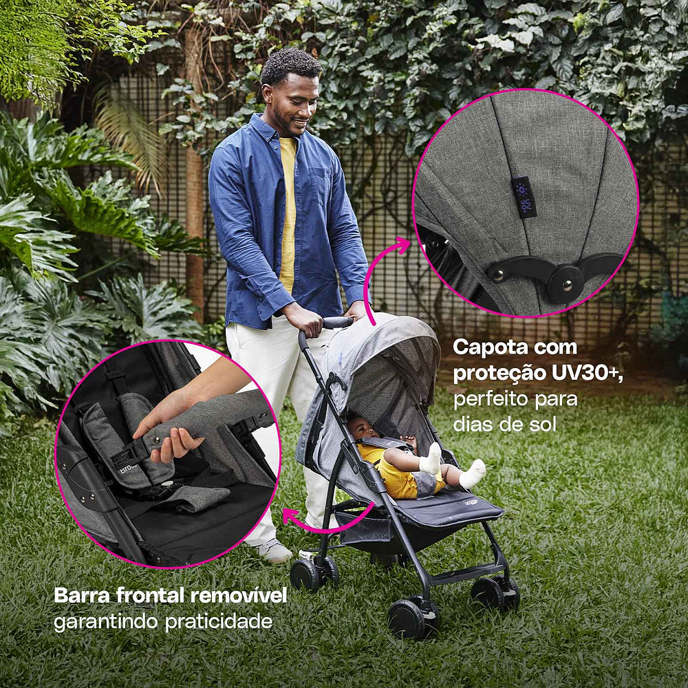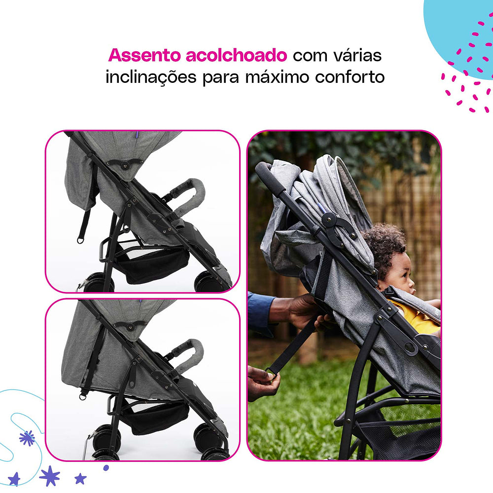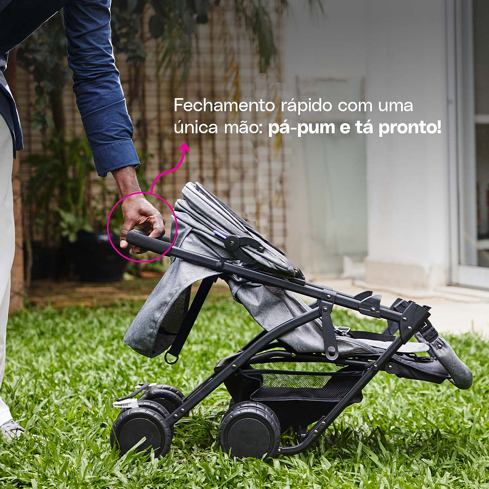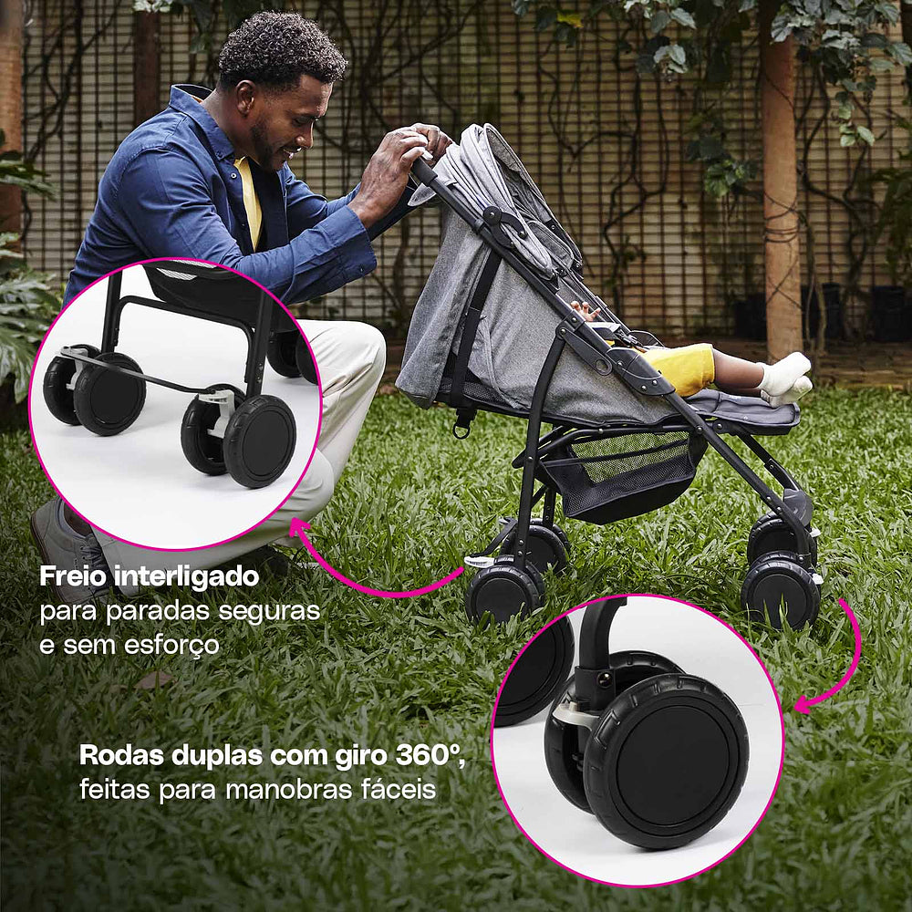 Desde o nascimento até os 15 kg, o assento reclinável vira berço para os recém-nascidos e, conforme seu pequeno cresce, o carrinho também evolui. Fechar o Bross é pá-pum: com uma mão só ele está pronto para guardar ou levar onde for preciso. As rodas duplas com giro 360° garantem estabilidade, enquanto o cinto de cinco pontos deixa tudo seguro para o pequeno explorador.