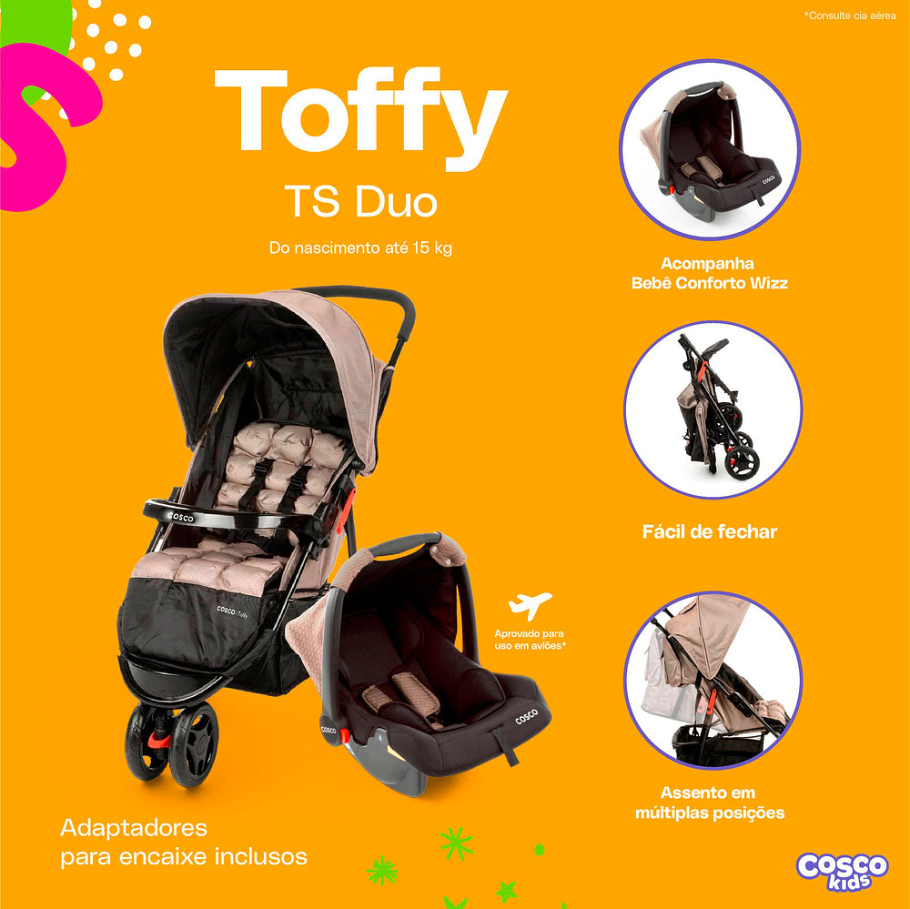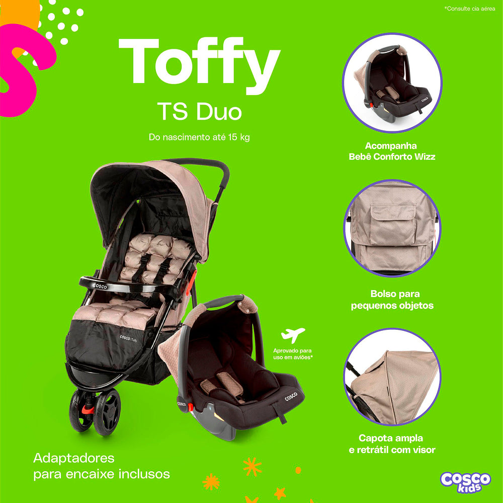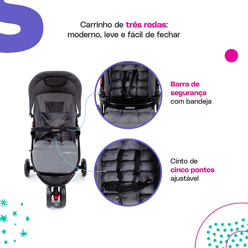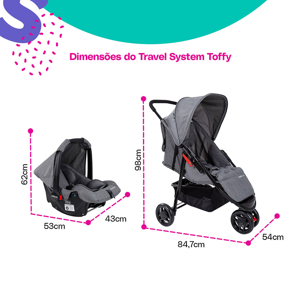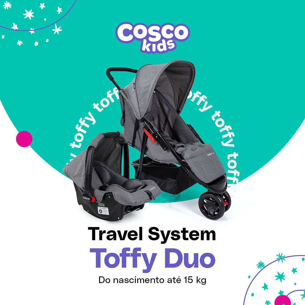Com o Travel System Toffy Cosco Kids, você tem tudo o que precisa para passeios cheios de estilo, conforto e segurança!