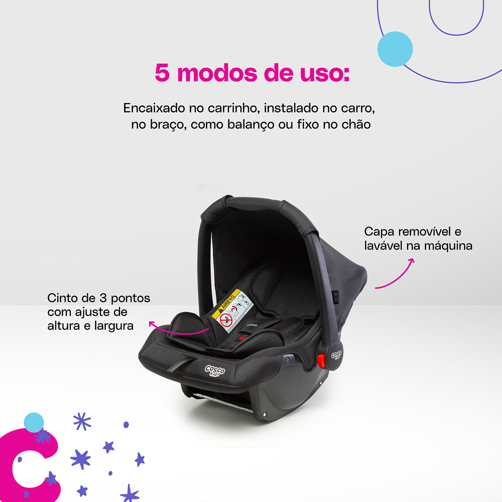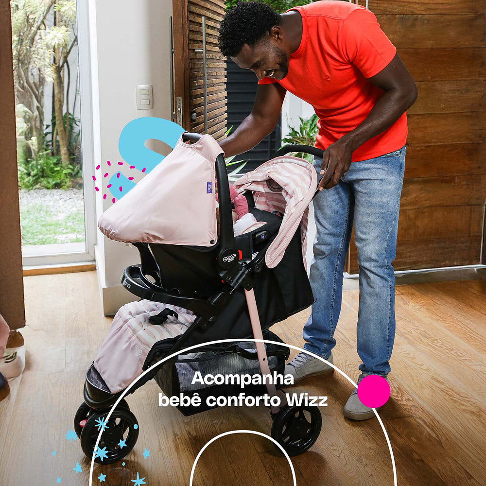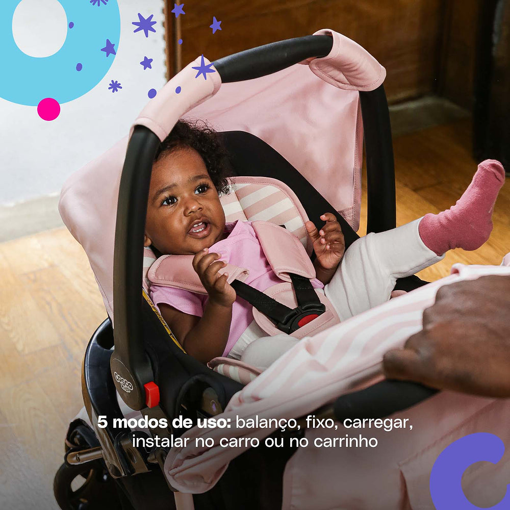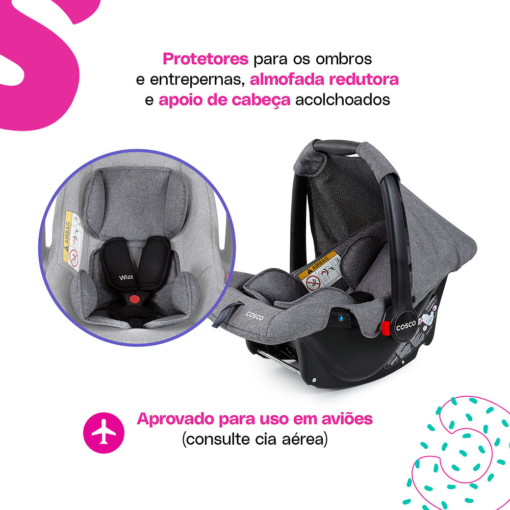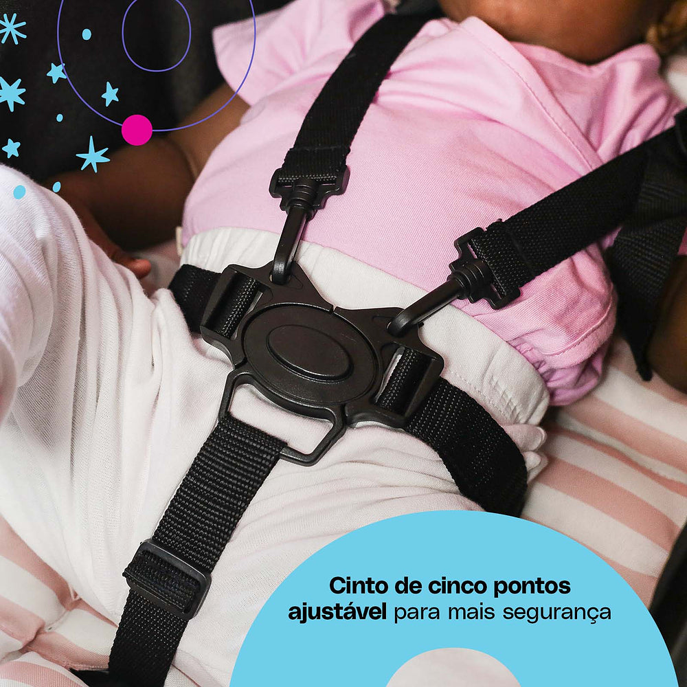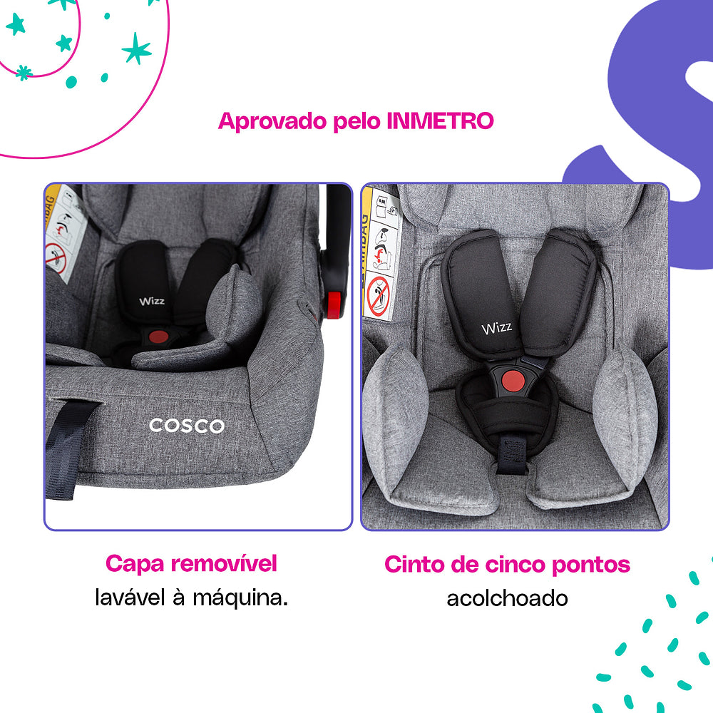 E tem mais: o bebê conforto Wizz completa esse sistema com cinco modos de uso. Ele pode ser fixo, usado como balanço, para carregar, instalado no carro ou encaixado diretamente no carrinho. Tudo isso com cinto de três pontos ajustável e almofada redutora para os bebês menores.