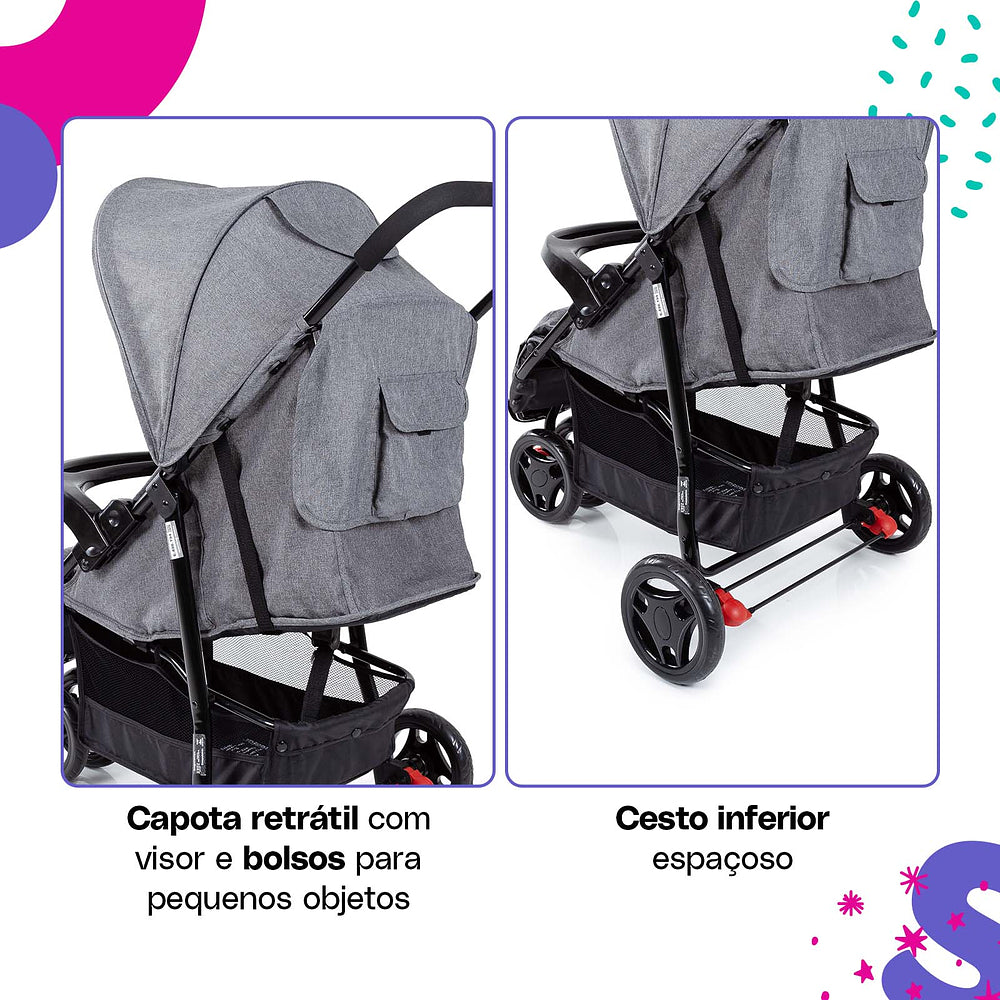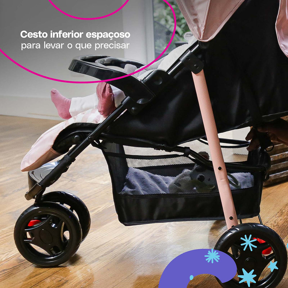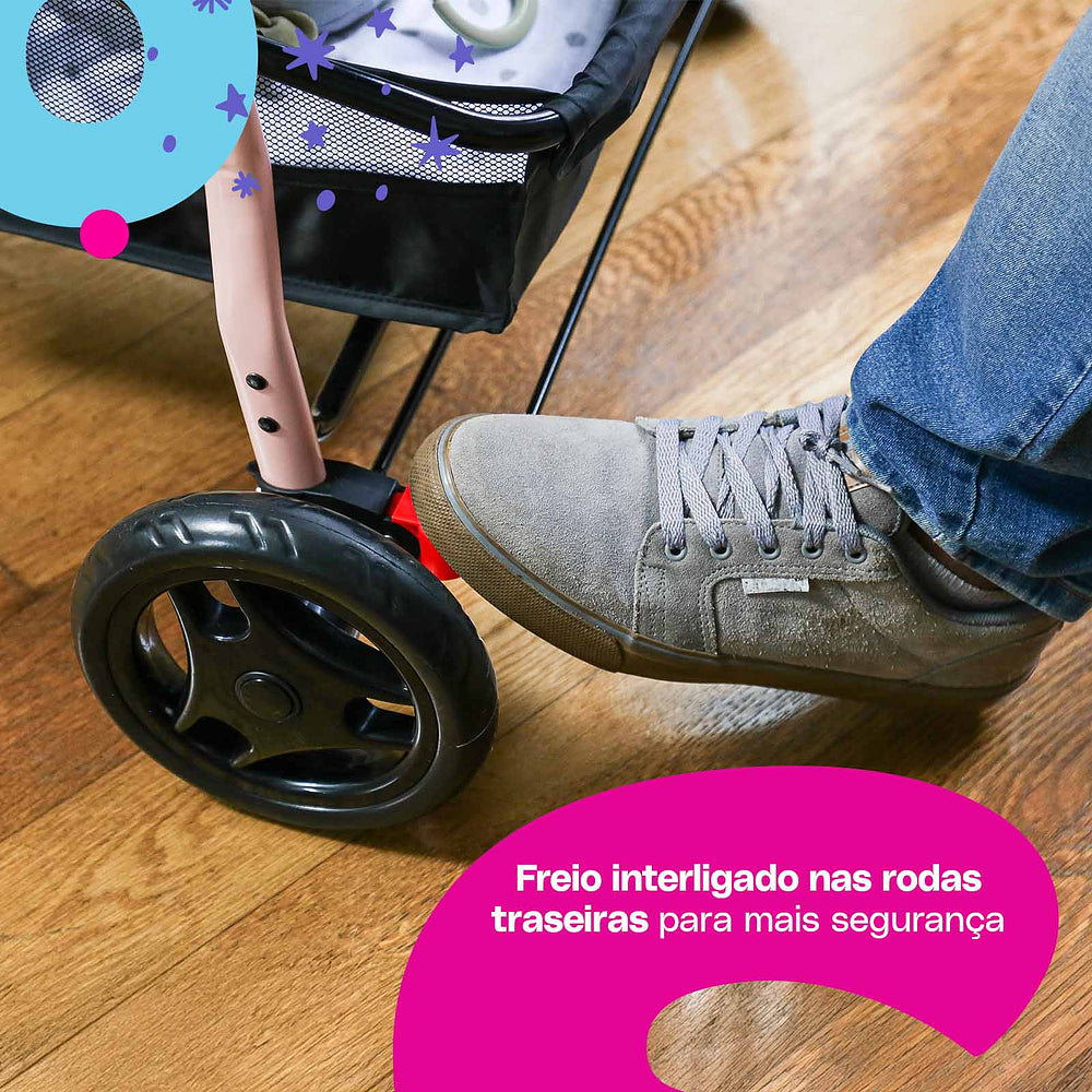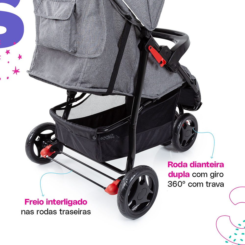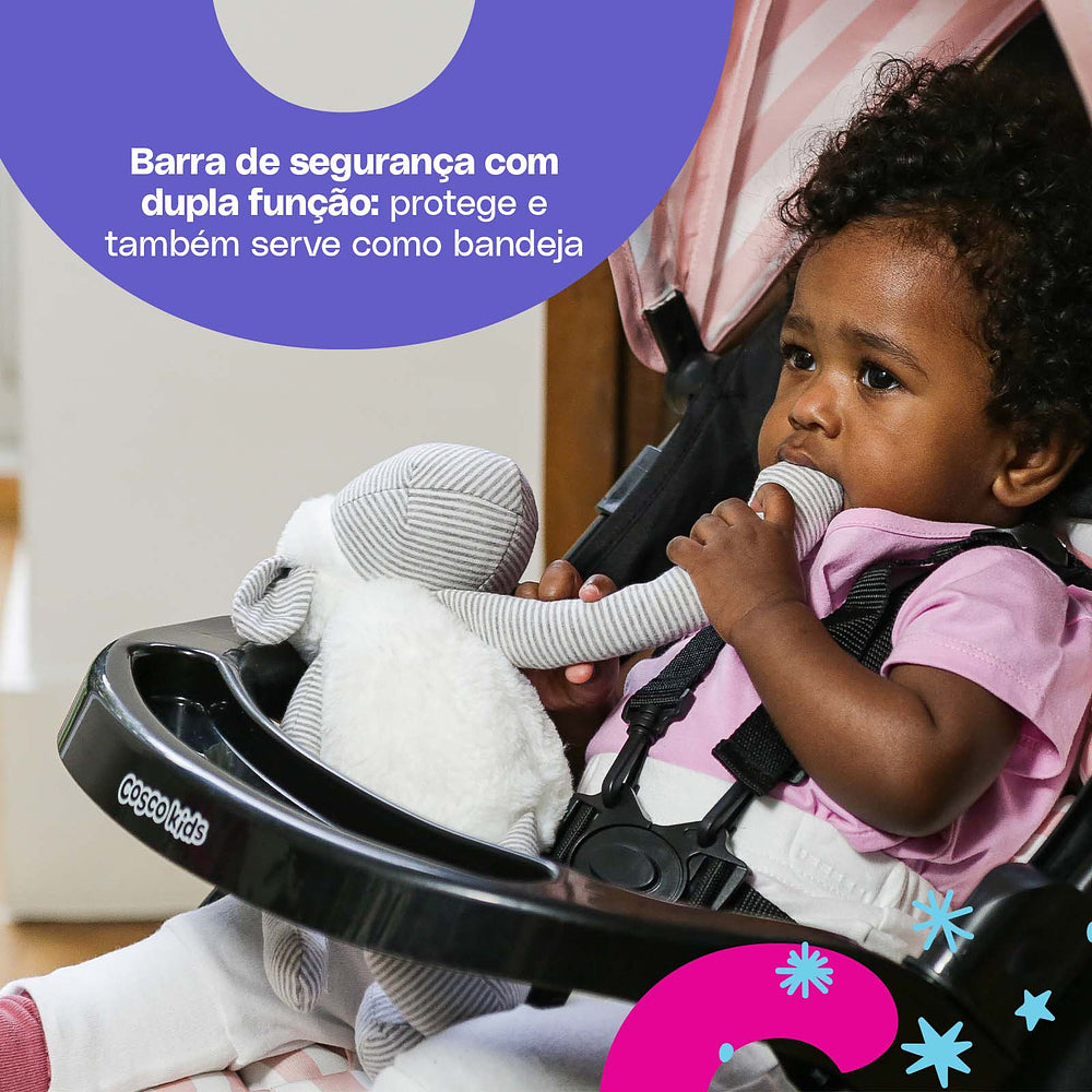 Para os passeios ficarem ainda mais tranquilos, ele conta com uma barra frontal de dupla função: protege e também serve como bandeja. A roda dianteira dupla tem giro 360° e trava de movimento, garantindo estabilidade em qualquer passeio.