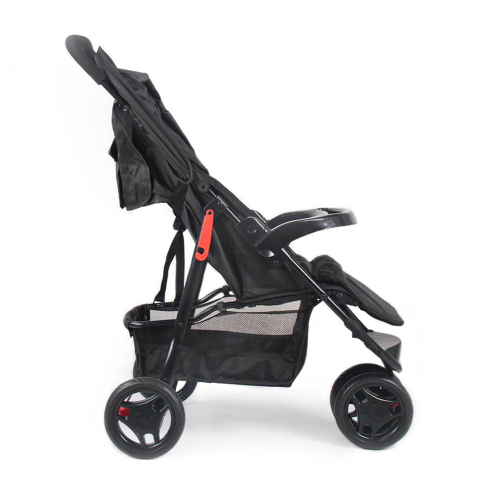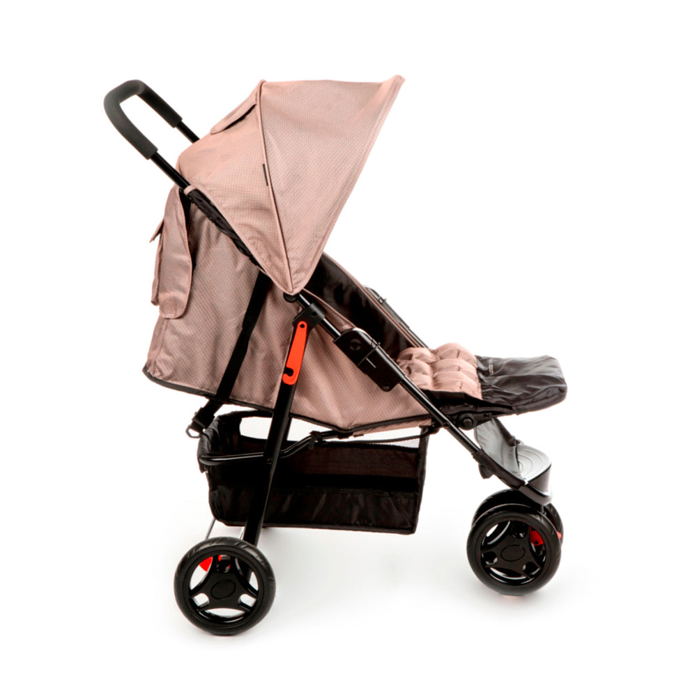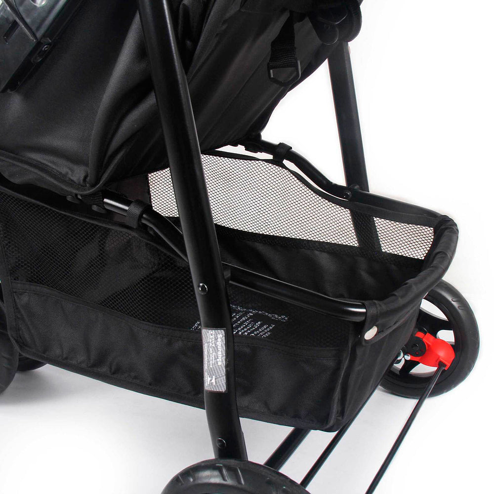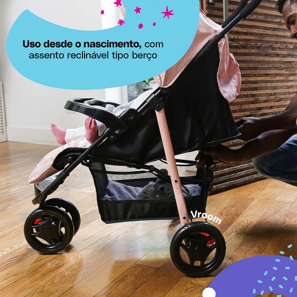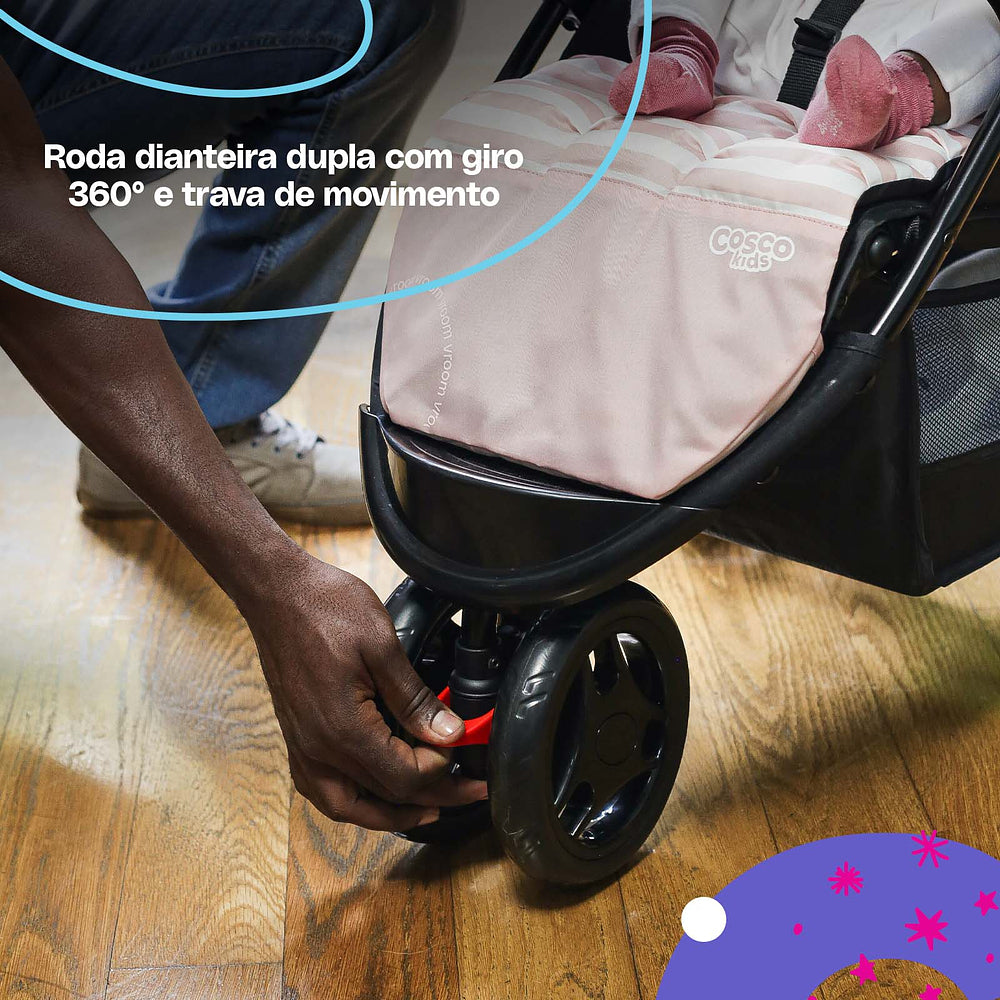 Para os passeios ficarem ainda mais tranquilos, ele conta com uma barra frontal de dupla função: protege e também serve como bandeja. A roda dianteira dupla tem giro 360° e trava de movimento, garantindo estabilidade em qualquer passeio.