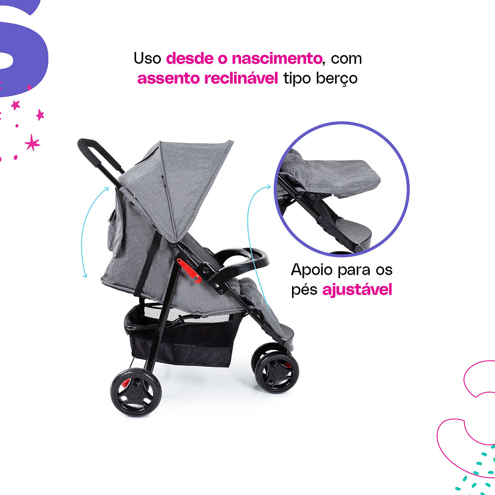 O Toffy é um carrinho de três rodas, o que significa mais leveza e mais facilidade para manobrar. Ele tem fechamento super prático e pode ser usado desde o primeiro dia de vida do bebê, com um assento que reclina até a posição total tipo berço. Com um colchonete macio e removível, o Toffy garante conforto e ainda é fácil de limpar.